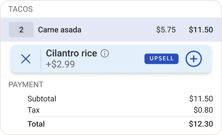 Menu pairing suggestions, modifier recommendations, and upgrade options automatically display on terminals and handhelds.